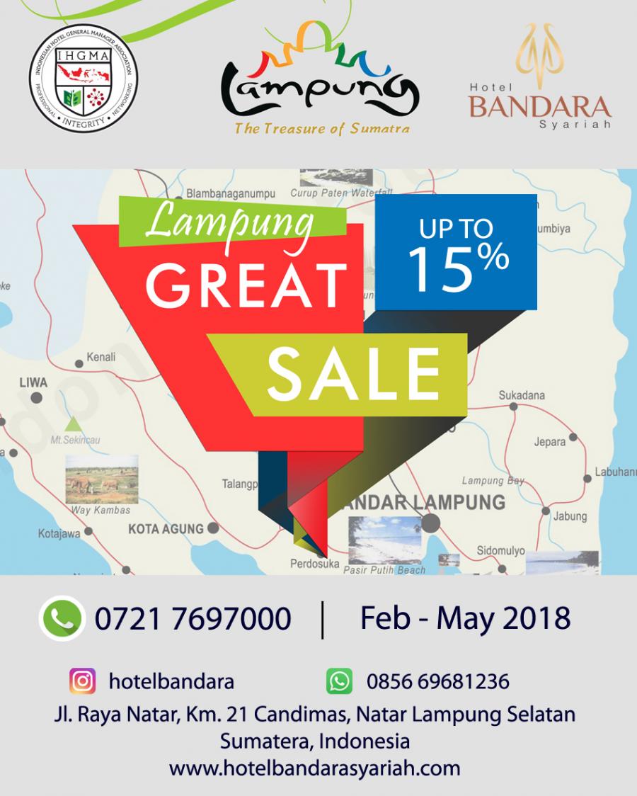 Wisatawan yang berkunjung ke Lampung akan dimanjakan dengan penawaran diskon besar-besaran pada program Lampung Great Sale 2018. Program yang baru diluncurkan oleh IHGMA Chapter Lampung ini menggaet seluruh penggiat pariwisata yang ada di Lampung. Setidaknya para pengunjung mall, kafe, spa, tamu-tamu hotel dan restoran, dan penumpang maskapai akan disuguhi diskon hingga 70%.